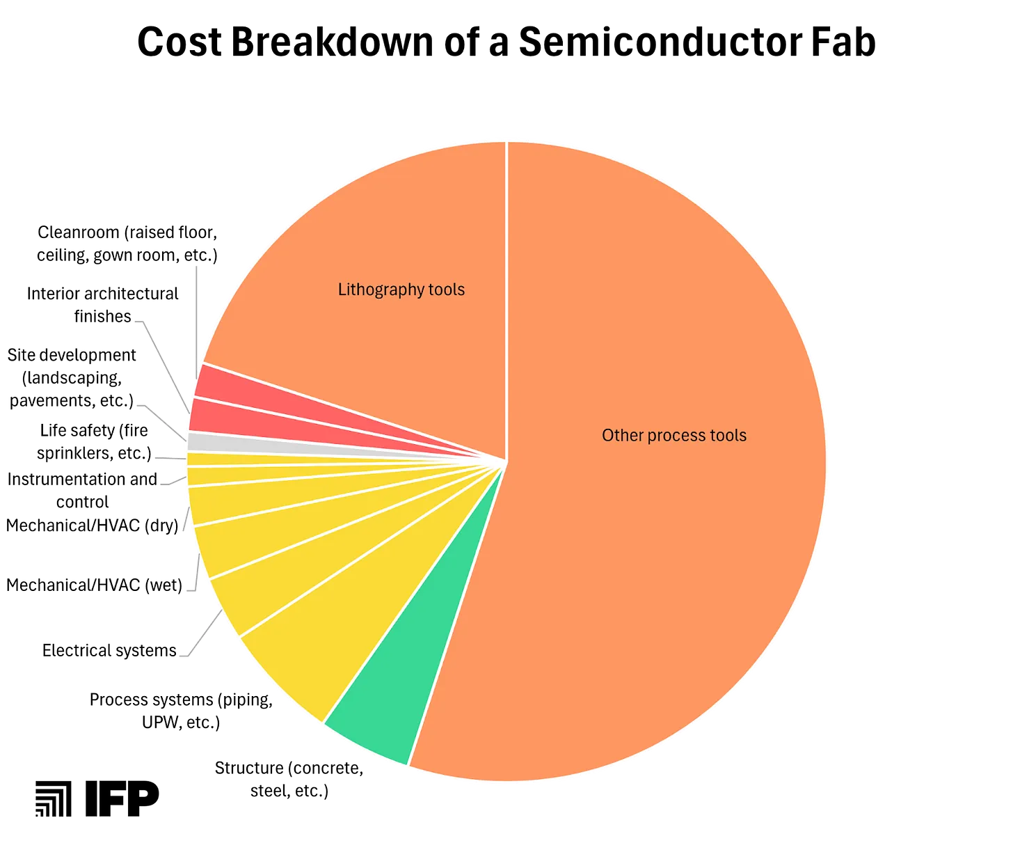 It's not surprising that building fabs is so expensive: they’re large, complicated, and have extremely stringent performance requirements. But the fab exists to provide the necessary environment for the thousands of process tools to function, and it's these tools that are by far the most expensive part of building a new fab. Roughly 70-80% of the cost of a new fab will be the process tools that go in it. (One side effect of this is that upgrading an existing fab to use a more advanced process node can cost an appreciable fraction of the cost of a totally new fab.)