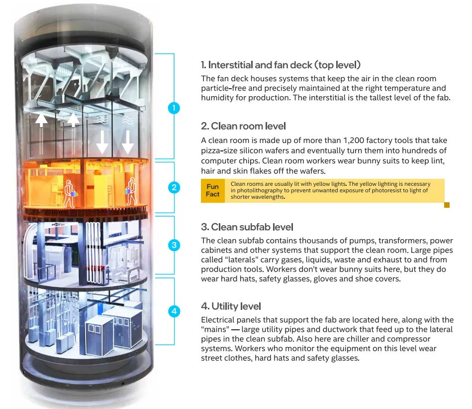 To create this environment, a modern semiconductor fab typically consists of four levels. The heart of the fab is the cleanroom level; the factory floor where the fabrication process actually takes place. Below the cleanroom is the sub-fab, one or more levels (typically two) that contain the ducts, piping, wiring, and equipment needed to support the cleanroom operations. And above the cleanroom level is an interstitial space with fans and filters used for recirculating air into the cleanroom below.