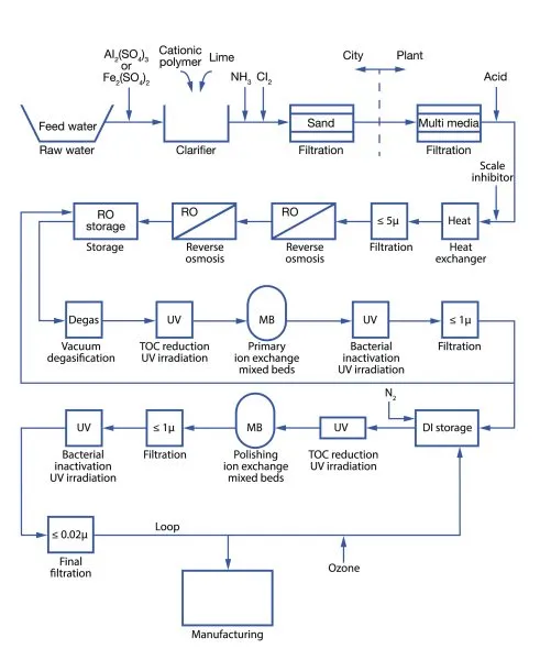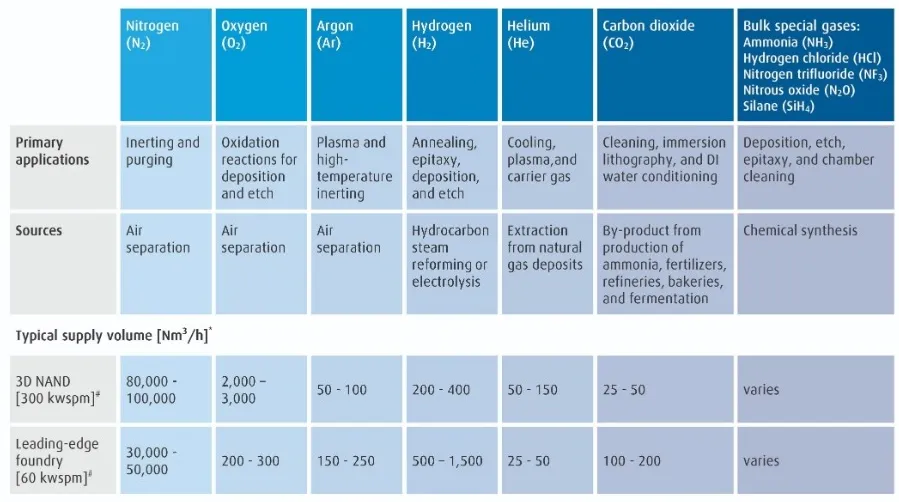 Outside of the sub-fab, many other facilities are required to support cleanroom operations. Moving heavy process tools into the cleanroom requires industrial elevators that can lift tens of thousands of pounds. A fab uses nitrogen and oxygen in such large amounts (a large logic fab might use 50,000 cubic meters of nitrogen every hour) that fabs will often have air separation plants on-site that produce gasses like nitrogen, oxygen and argon. Similarly, a fab will use very large amounts of ultrapure water for wafer cleaning and CMP, along with the regular water for things like chillers for process cooling. A large fab can use millions of gallons of ultrapure water a day, as much as a town of 50,000 people, and producing it requires its own specialized plant. As with other aspects of the fab, the requirements for ultrapure water have gotten more stringent as features have shrunk. Other fab support equipment includes boilers, chillers, emergency generators, and wastewater treatment.