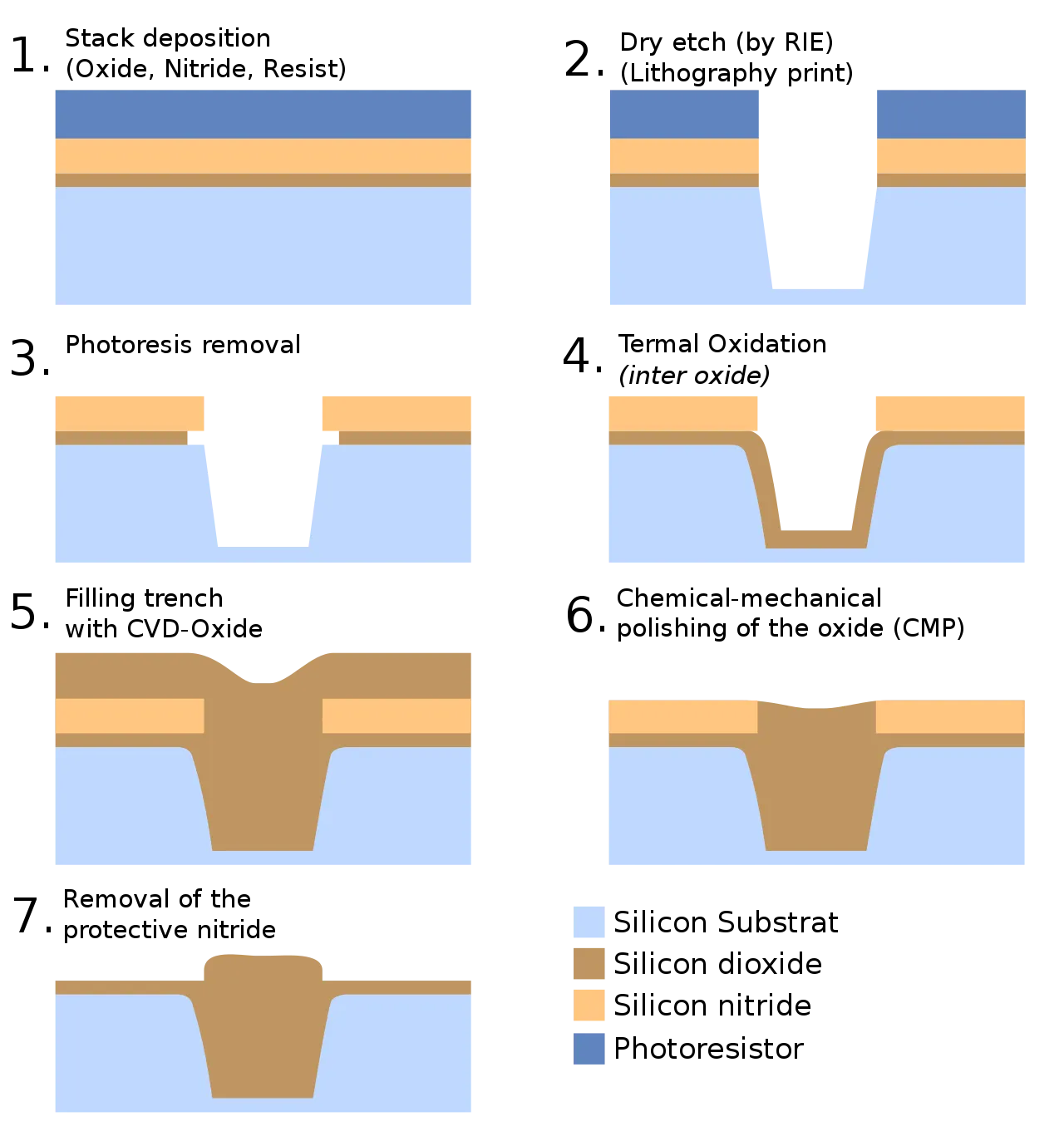 In addition to these four basic processes, semiconductor manufacturing involves many other supporting processes. One key supporting process is polishing: because a microchip is built up from dozens of individual layers, variations in layer thickness will propagate over time as more layers are added, causing problems if left unaddressed. To combat this, wafers are frequently polished during the fabrication process using chemical mechanical polishing (CMP) to smooth out the wafer surface. CMP is also used to fill holes created by etching, by applying a layer of material to the entire wafer and then polishing away the material above the hole.