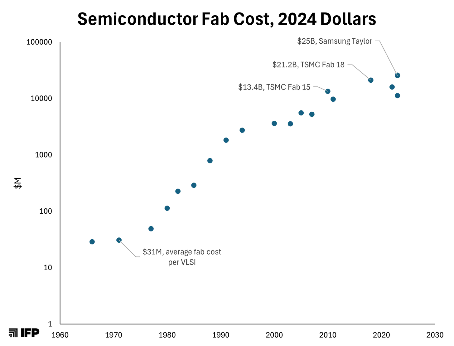 The same shrinking and cheapening has happened for every semiconductor component. But at the same time, the facilities to manufacture them have become increasingly expensive. In the late 60s and early 70s, a semiconductor fabrication facility (or ‘fab’) cost on the order of $4 million (~$31 million in 2024 dollars). Today, a modern fab can cost $10-$20 billion or more. Intel is building a pair of fabs in Arizona which are projected to cost $15 billion apiece, and Samsung’s fab in Taylor, Texas is projected to cost $25 billion.