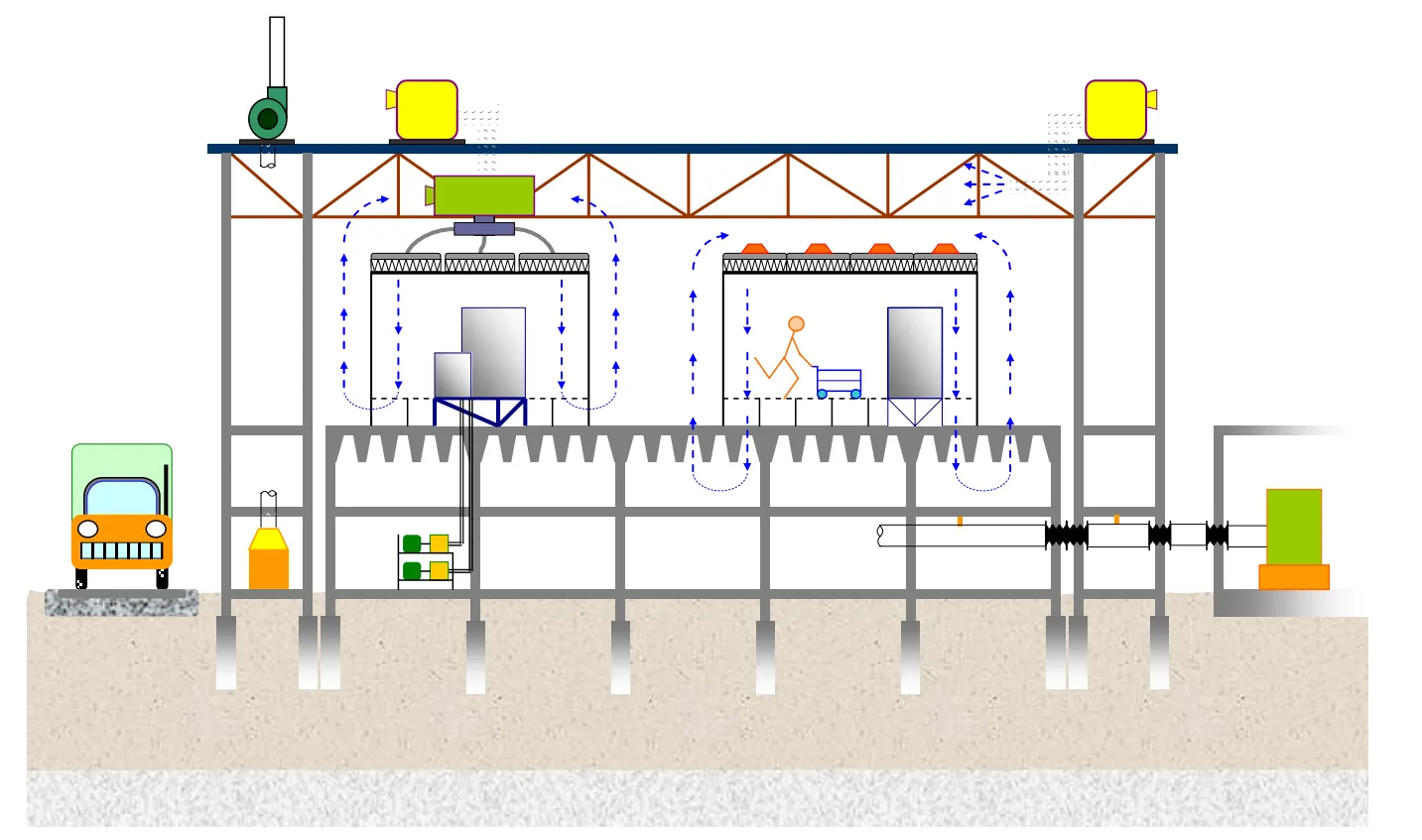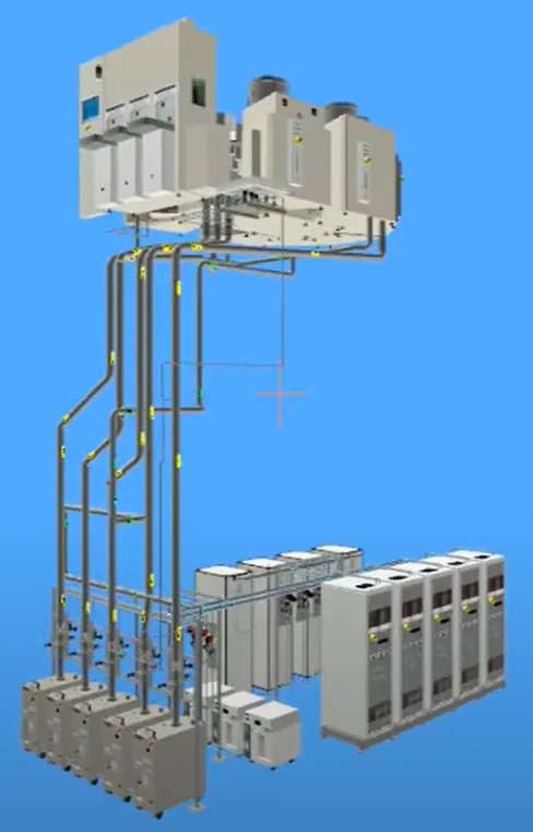 In addition to chemical handling and exhaust equipment, the sub-fab contains electrical boxes, transformers, fans, air handlers, chillers, RF generators, heat exchangers, and all the other equipment needed to keep the fab tools operating. Sub-fabs are often divided into a “clean” sub-fab (where the air from the cleanroom recirculates), and a separate “dirty” or utility sub-fab below that. And while the level of control can be relaxed somewhat in the sub-fab (workers don’t need to wear bunny suits in it), variations and potential disruptions must still be minimized. Even slight changes in voltage, pressure, or vibration, or the smallest particle emitted by the piping, can negatively affect the manufacturing process.