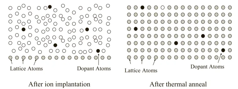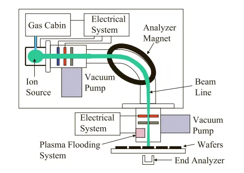 Early on, the primary method of introducing impurities in semiconductor manufacturing was diffusion: by heating the wafer up in the presence of a gas, atoms of the gas would diffuse into the wafer surface. But today doping is primarily done via ion implantation: a beam of ions (atoms with an excess or deficit of electrons, giving them an electrical charge) is fired at the wafer, depositing the atoms below the surface.