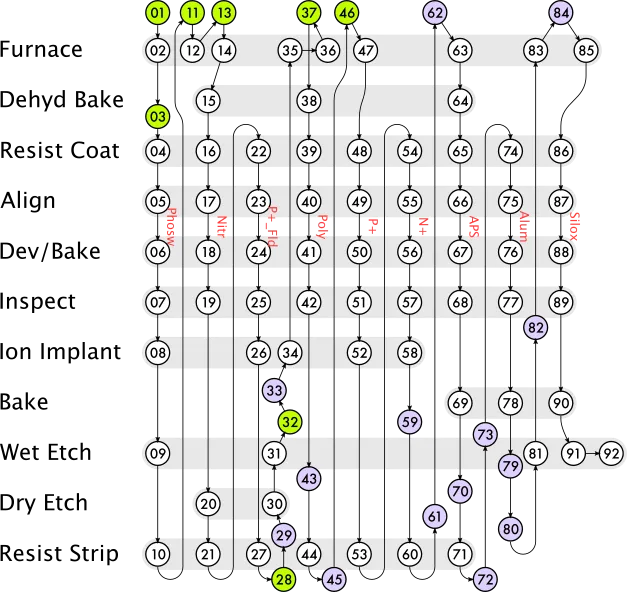 By applying these four basic processes over and over again, along with the various support processes, the structure of a microchip is slowly built up. And as more transistors have been crammed onto an integrated circuit, this structure (and the process for creating it) has become increasingly complex. Early integrated circuits could be made with just five to ten different masks and dozens of process steps, but a modern leading-edge microchip might require 80 or more masks and thousands of separate process steps.